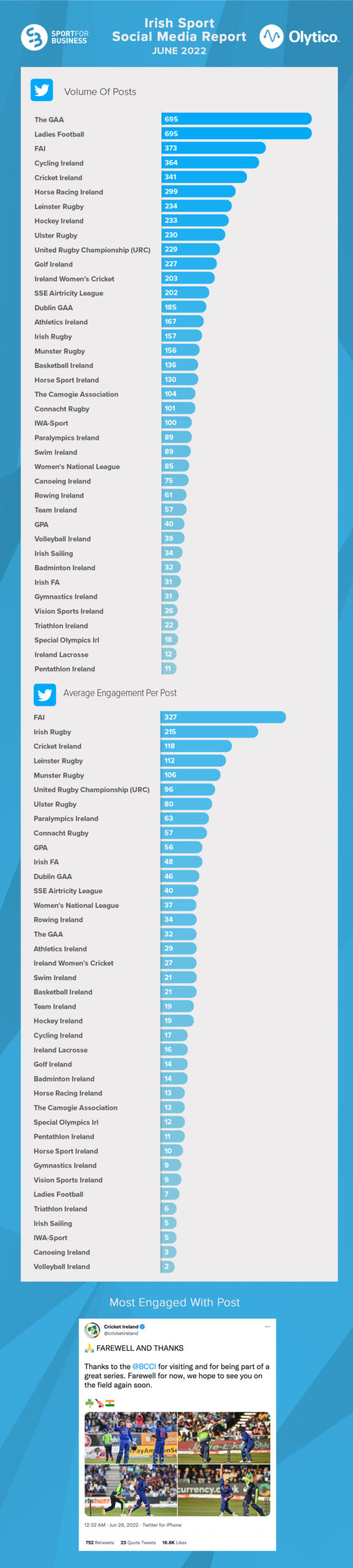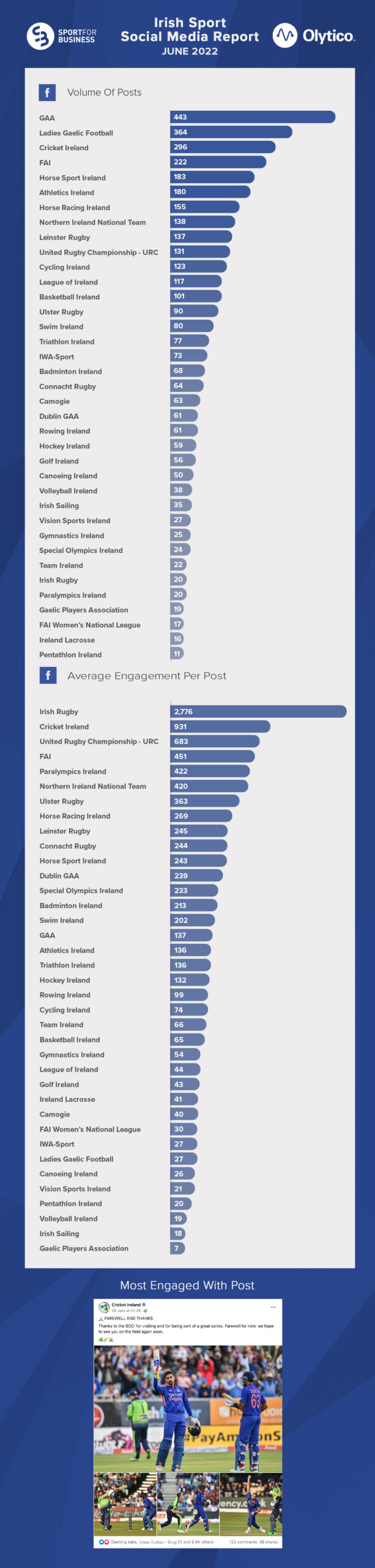 In second, Cricket Ireland (931, +240 per cent) benefitted from the huge engagement the Indian cricket team bring with them wherever they are playing in the world – seven of the top ten posts on Facebook came from the Cricket Ireland account and all featured the Indian Series, which was a contributing factor to the platform’s record month.