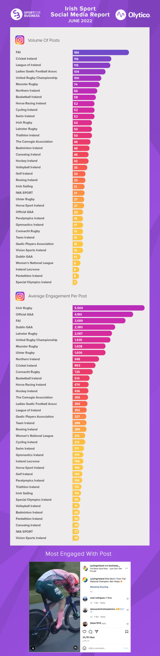 The top Instagram post for May came from Cycling Ireland, a first for the organisation, as Ben Healy took the Elite Men’s Time Trial National Championship. The post generated over 32,000 engagements in the form of likes and comments.