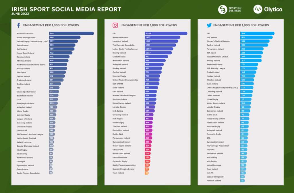 Badminton Ireland took the top spot in the ‘average engagements per 1,000 followers’ metric for the third month in a row with 958 engagements per 1,000 followers – what is particularly impressive is the growth of these numbers for the organisation, June’s figures were a 68 per cent increase on the previous month.