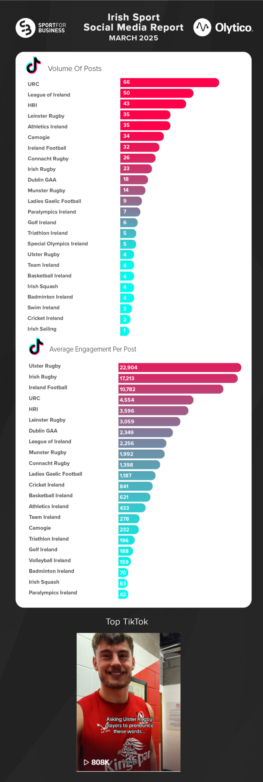 434 TikToks (+8%) were posted by Sport for Business members in March 2025, which resulted in 1.4 million engagements (-31%) and 22.82 million views (-47%).