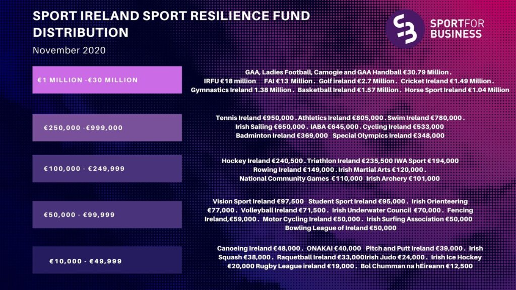 Sport Ireland managed an open application process from across the sporting ‘ecosystem’ to distribute funding that it says will “allow sports organisations to off-set significant losses incurred in recent months and add a semblance of certainty to planning for 2021.