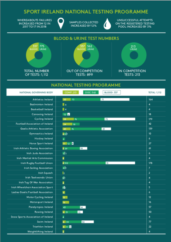 Last year, through the national testing programme Sport Ireland conducted 1,112 tests. This included 337 blood tests and 775 urine tests, marking a 12% increase on 2017.