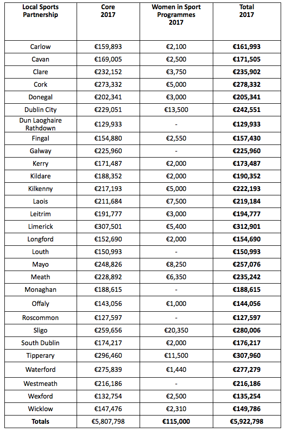 Funding for the network of Local Sports Partnerships across the country is to increase from €5.1 million in 2016 to €5.9 million this year