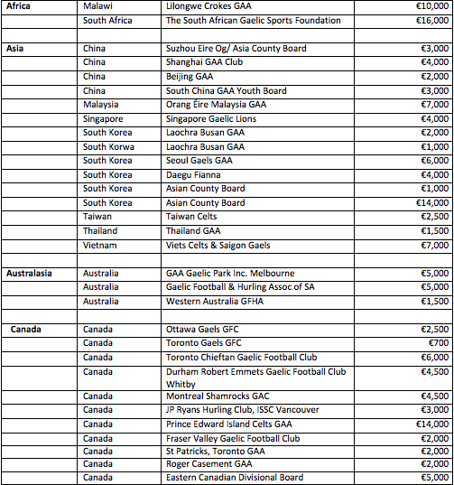 Since 2013, through the Global Games Development Fund, the Department of Foreign Affairs and Trade and the GAA have provided matched funding for developmental projects in GAA clubs in Asia, Australasia, Canada, Europe, the Middle East, Africa and South America.