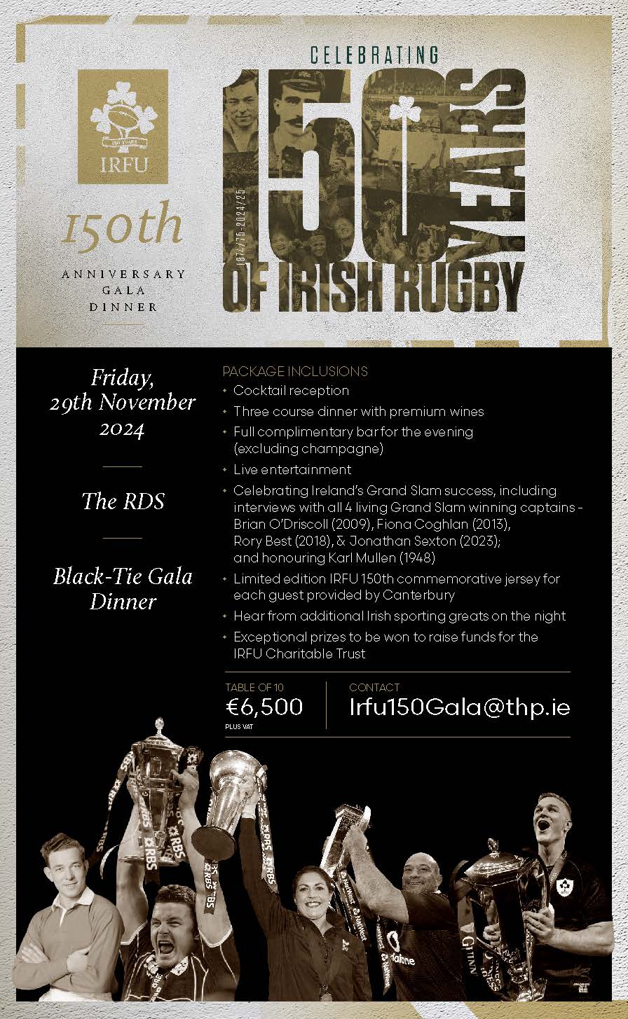 The IRFU will host a 150th Gala Dinner on Friday, 29th November 2024 in the RDS which will raise funds to support the 150th Anniversary programme together with the IRFU Charitable Trust.