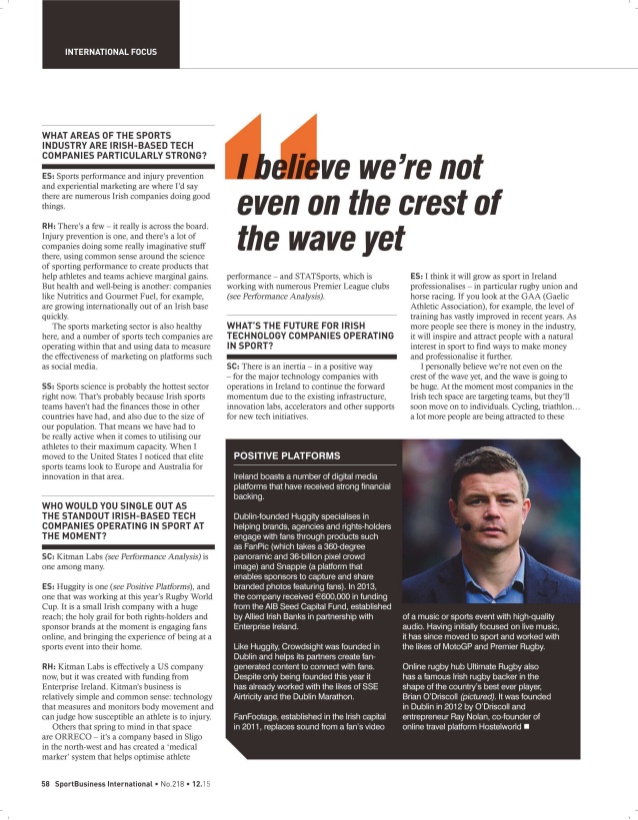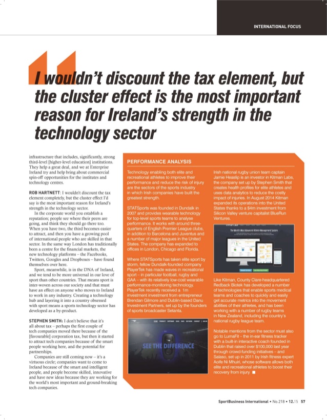 “Sport is in the DNA of Ireland and we tend to be more universal in our love of sport than other countries. That means sport is inter-woven across our society and that has an impact on anyone who moves to Ireland to work in any industry. Creating a technology hub and layering it into a country obsessed with sport means a sports technology has emerged as a by product.” -Rob Hartnett, Sport for Business