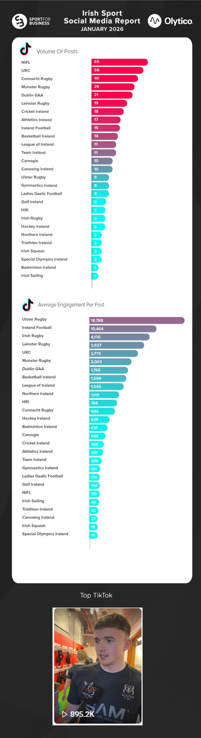 Olytico’s analysis of Irish Sport on Social Media for January 2026 covers 12,200 posts, 4 million public engagements, and close to 16 million Tik Tok views.