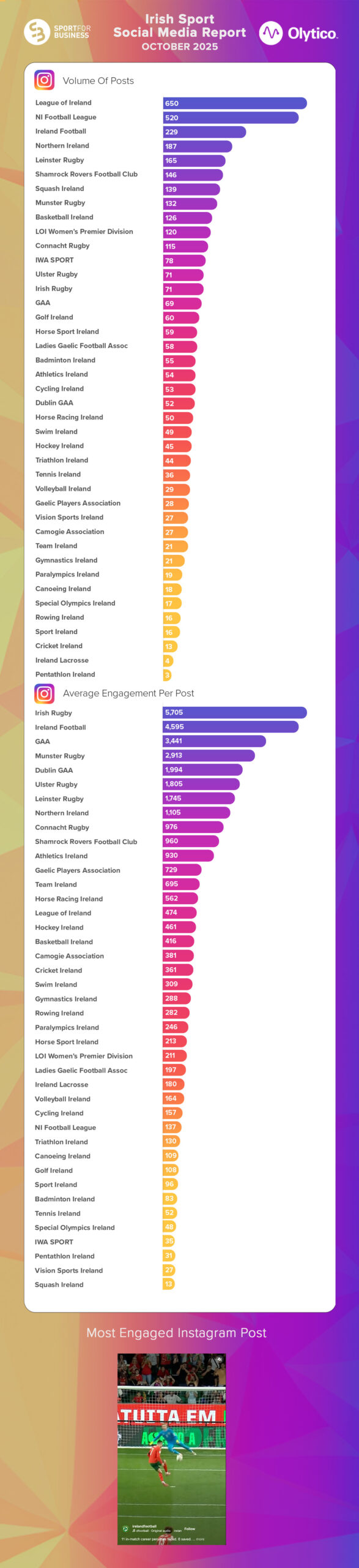 The League of Ireland led in activity across multiple platforms, while Irish Rugby and Ireland Football delivered high-performing content on Instagram and TikTok.