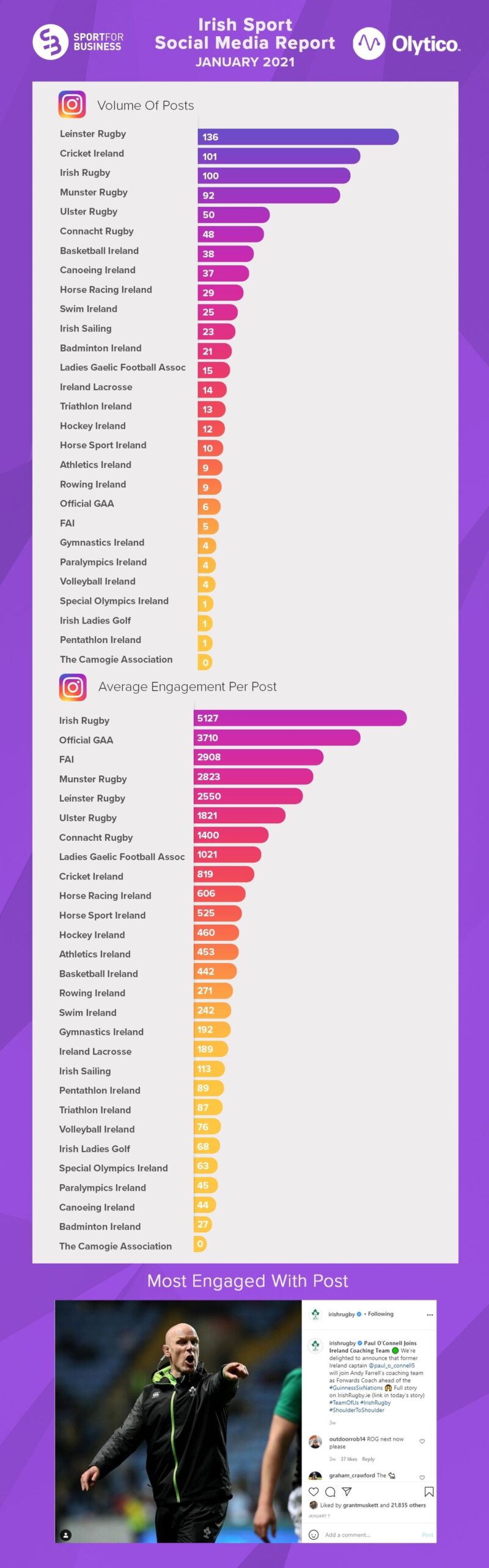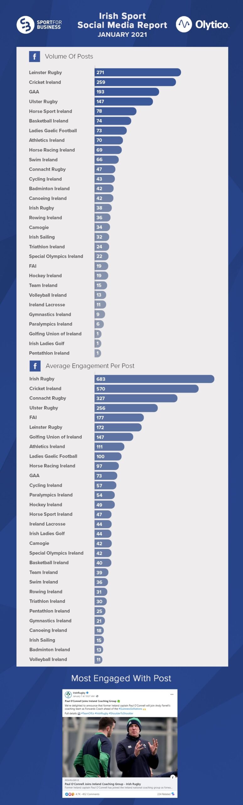Irish Rugby announcing Paul O’Connell was to join Andy Farrell’s coaching team ahead of the Guinness 6 Nations was the most popular Facebook content across the Sport for Business Members during December enjoying over 4,700 reactions, 340+ comments with the post being shared on more than 220 occasions.