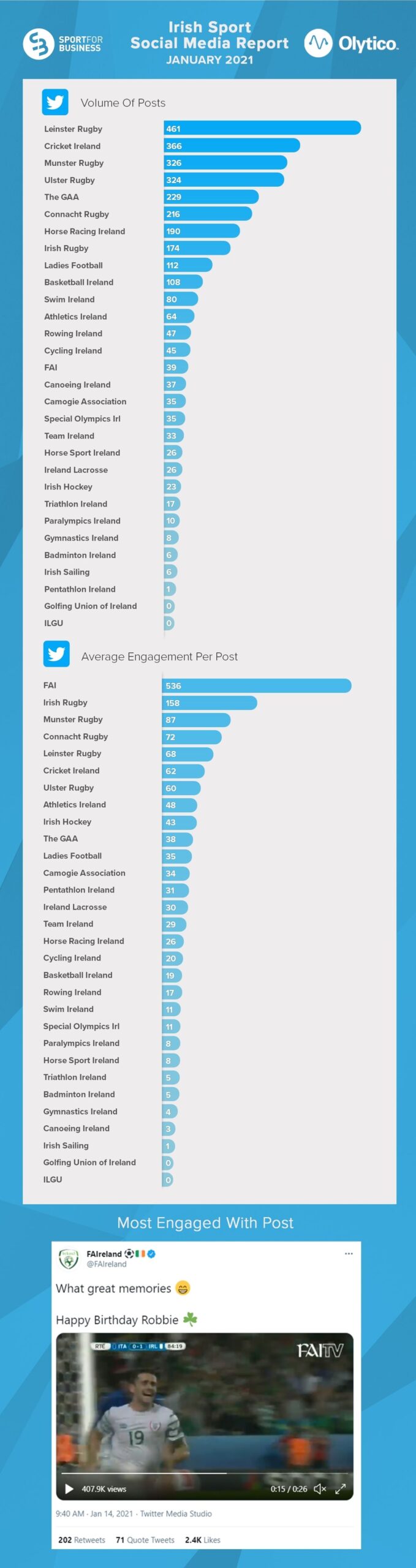 There was no change in the top three with the FAI on top with an average of 222 engagements per tweet, holding off Irish Rugby (with an average of 158 engagements per tweet) and Munster Rugby (averaging 87 engagements per tweet).