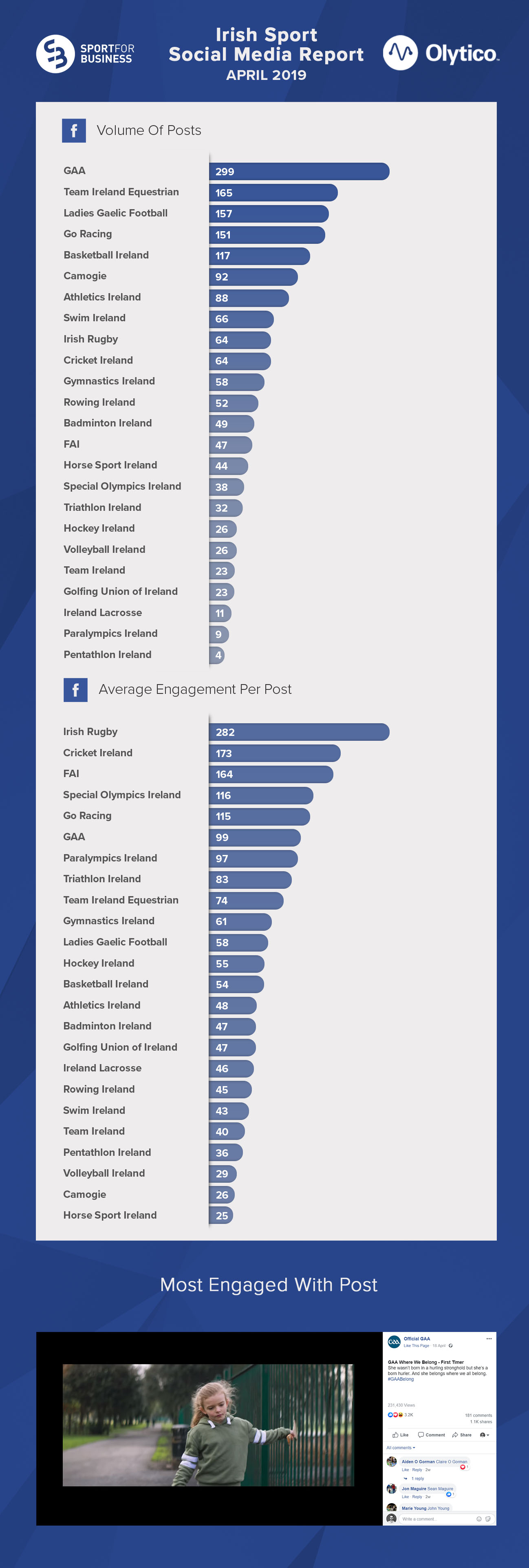 Irish Rugby retained their place as the most engaged with organisation on Facebook, with almost 300 likes, shares or comments on average per post in April.