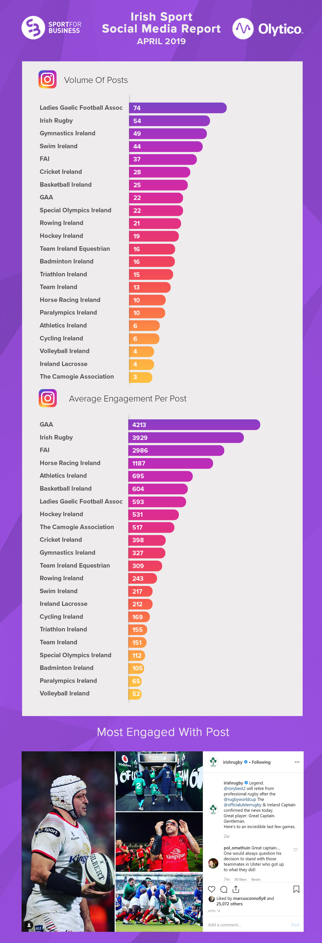 Despite dropping into second spot overall, the top post in April once again came from Irish Rugby, congratulating Rory Best on an incredible career in the wake of his professional rugby retirement announcement.