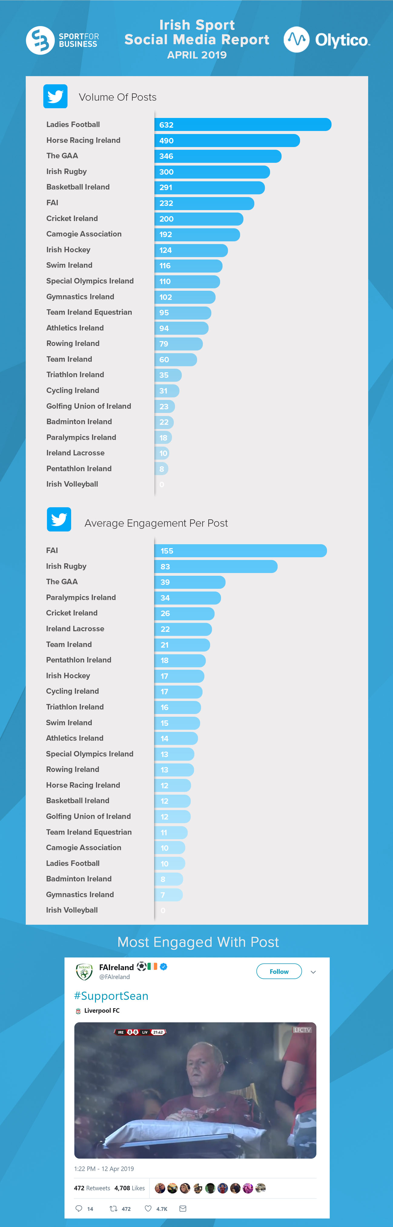 April 2019 was a month in which the FAI dominated the Irish sporting and political agenda. On Twitter, they retained top spot for engagement with over 150 likes and retweets on average per post.
