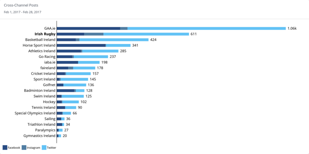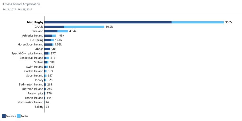 Amplification is retweets and Facebook shares which empowers you to reach new audiences. In that regard, Irish Rugby stood tall with 30.7k cross-channel amplifications, 70% of which came on Facebook. That was 3 times more than the GAA, despite 40% less content. The old adage of quantity over quality.