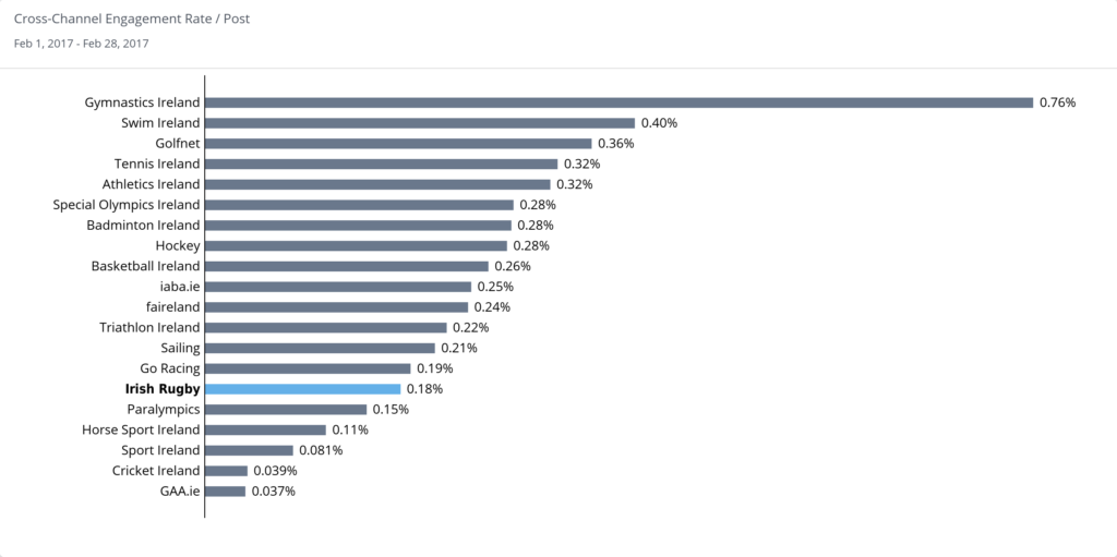 Engagement wise, the numbers for Irish Rugby were in the bottom quadrant, mainly due to their size; a 1.3m audience. Topping this table is Gymnastic Ireland, the fourth such month. This is due to their content really resonating with their audience.