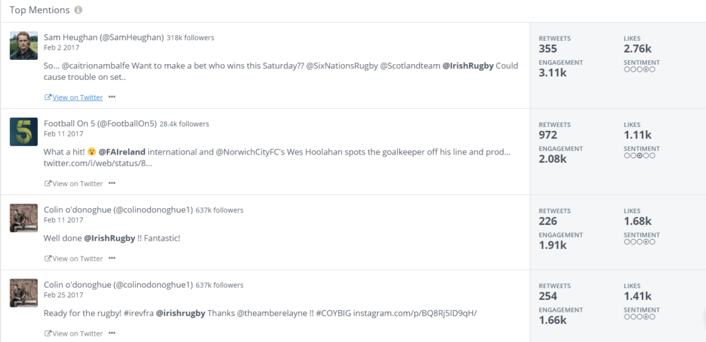 Radio Presenter Dermot O’Leary, of Big Brother, Scottish actor Sam Heughan and Once upon a time star Colin O’Donoghue all tweeted about Irish Rugby with a combined likes of 5k while the President of Ireland, Michael D Higgins and Brian O’Driscoll also got in on the act.