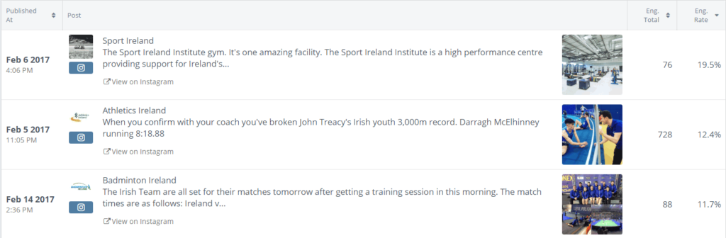Looking at individual posts, Sport Ireland, Athletics Ireland and Badminton Ireland all broke the 10% engagement rate barrier with Instagram posts