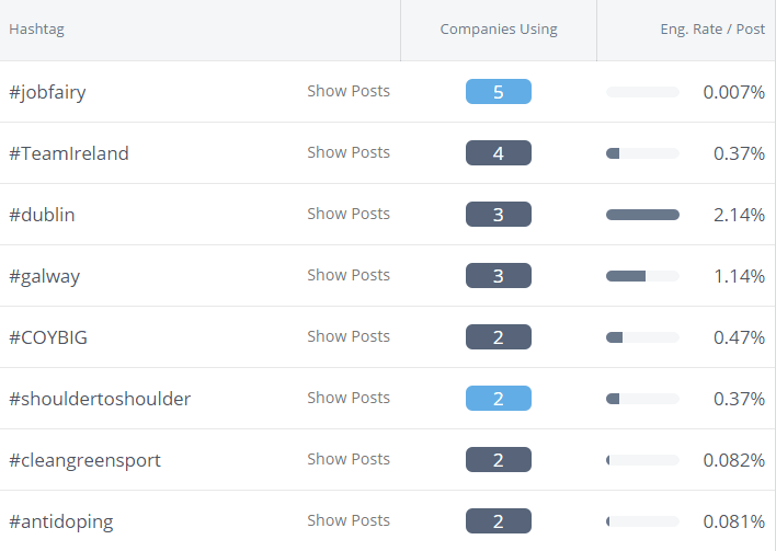 Hashtag wise, #jobfairy used by 5 different bodies was the most popular with #Dublin (used by Basketball Ireland, Sport Ireland and Go Racing) generating the highest engagement per post.