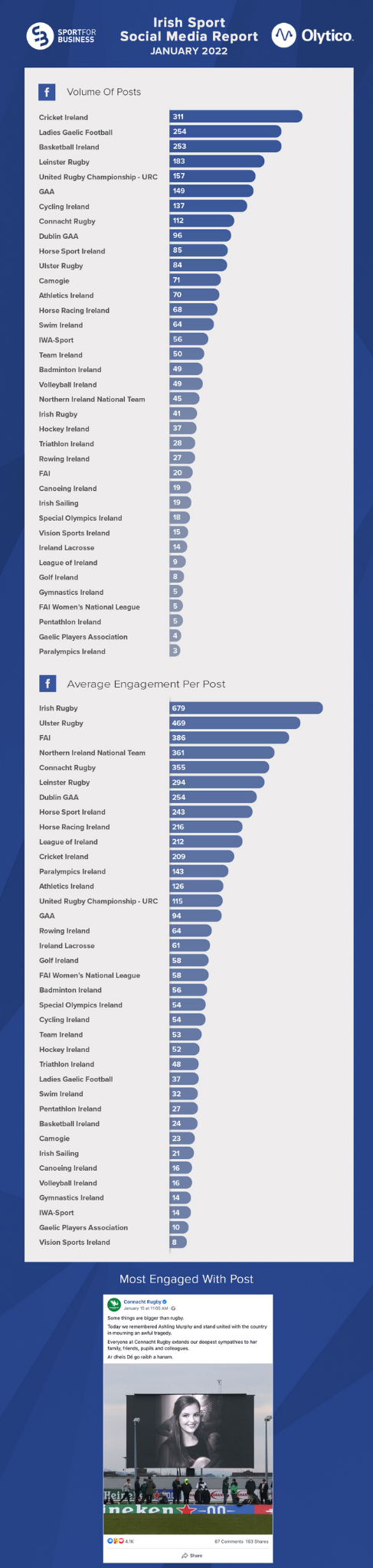 In our new metric, Connacht top the table (average of 404 engagements per 1,000 followers), followed by Cycling Ireland (310) and Leinster Rugby (279). Special mentions to Volleyball Ireland (206) who welcomed the easing of Covid restrictions for indoor sports.