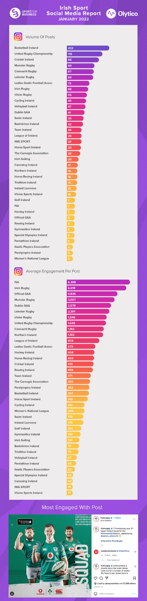 The top Instagram post for January came from the IRFU as they announced the 37 man squad for the Guinness Six Nations, with the post generating over 18,000 engagements in the form of likes and comments.