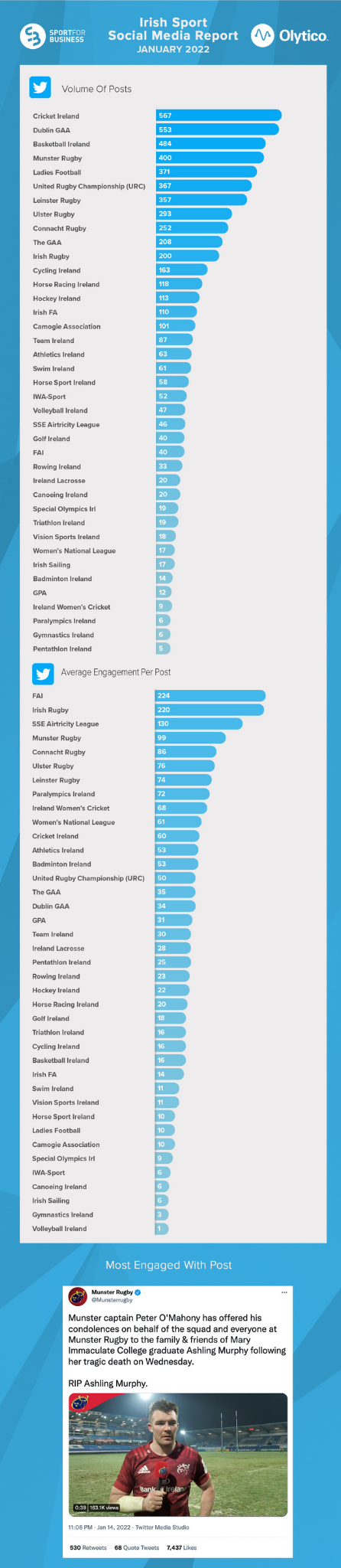 Basketball Ireland topped the activity charts for the first time since August 2021, their 202 posts, a 254% increase on December; and their top post featured action from Devin Gilmore of Eanna Basketball in the National Cup. Whilst falling one place into second, the United Rugby Championship increased their month-on-month output (115, +26 per cent) showcasing skills from Springbok Lukhanyo Am.