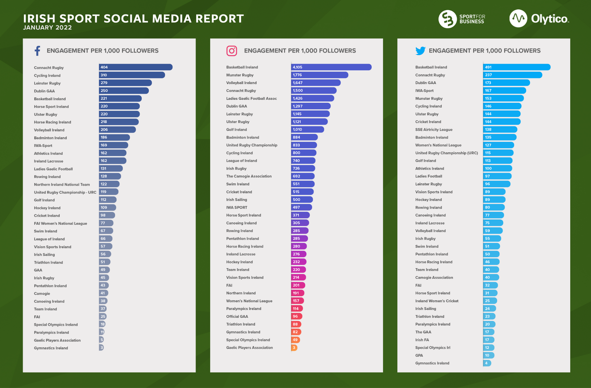 Completing an impressive month for the NGB, Basketball Ireland topped the Instagram ‘Engagements per 1,000 followers’ chart (4,105) followed by Munster Rugby (1,776) and Volleyball Ireland (1,647).