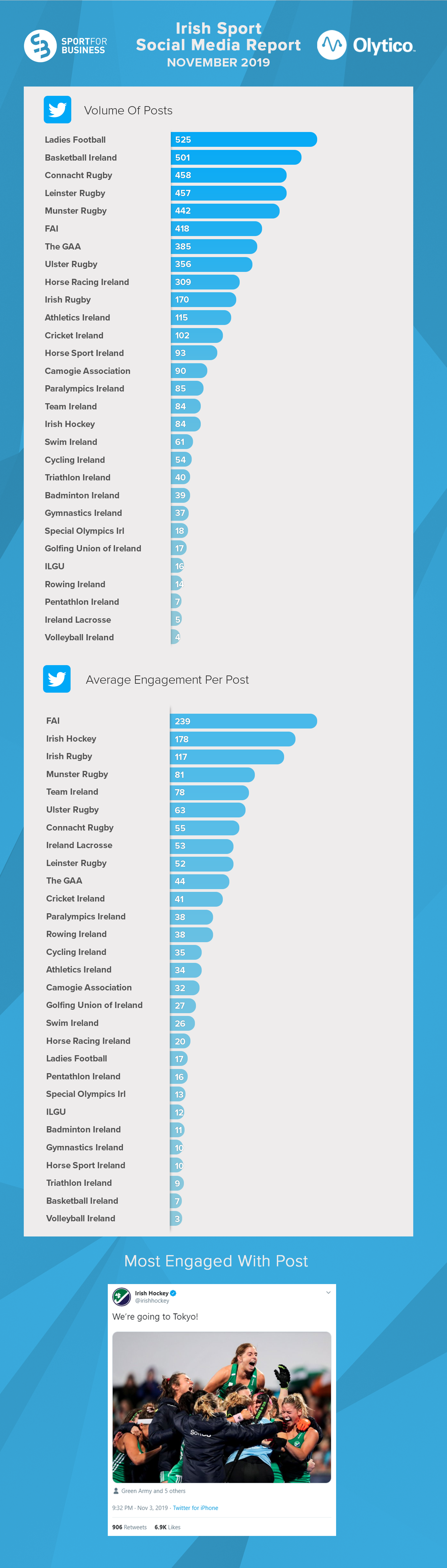 After months of domination by Irish Rugby, November represented a change in the top-performing organisations on both the engagement rankings and most engaged with posts across all three networks.