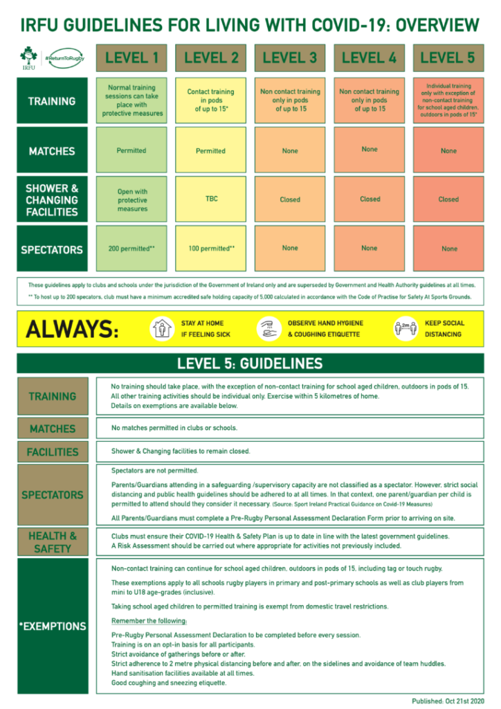 Irish Rugby is the latest sport to issue guidelines around level five with a good visual approach.