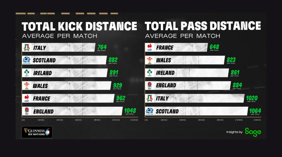 Mitchell had the highest average pass distance in the 2023 Guinness Six Nations (8.8 metres), while England were the only team to average over a kilometre of kicking metres per match. How will distribution via passing balance with the territorial play of this new-look England side?