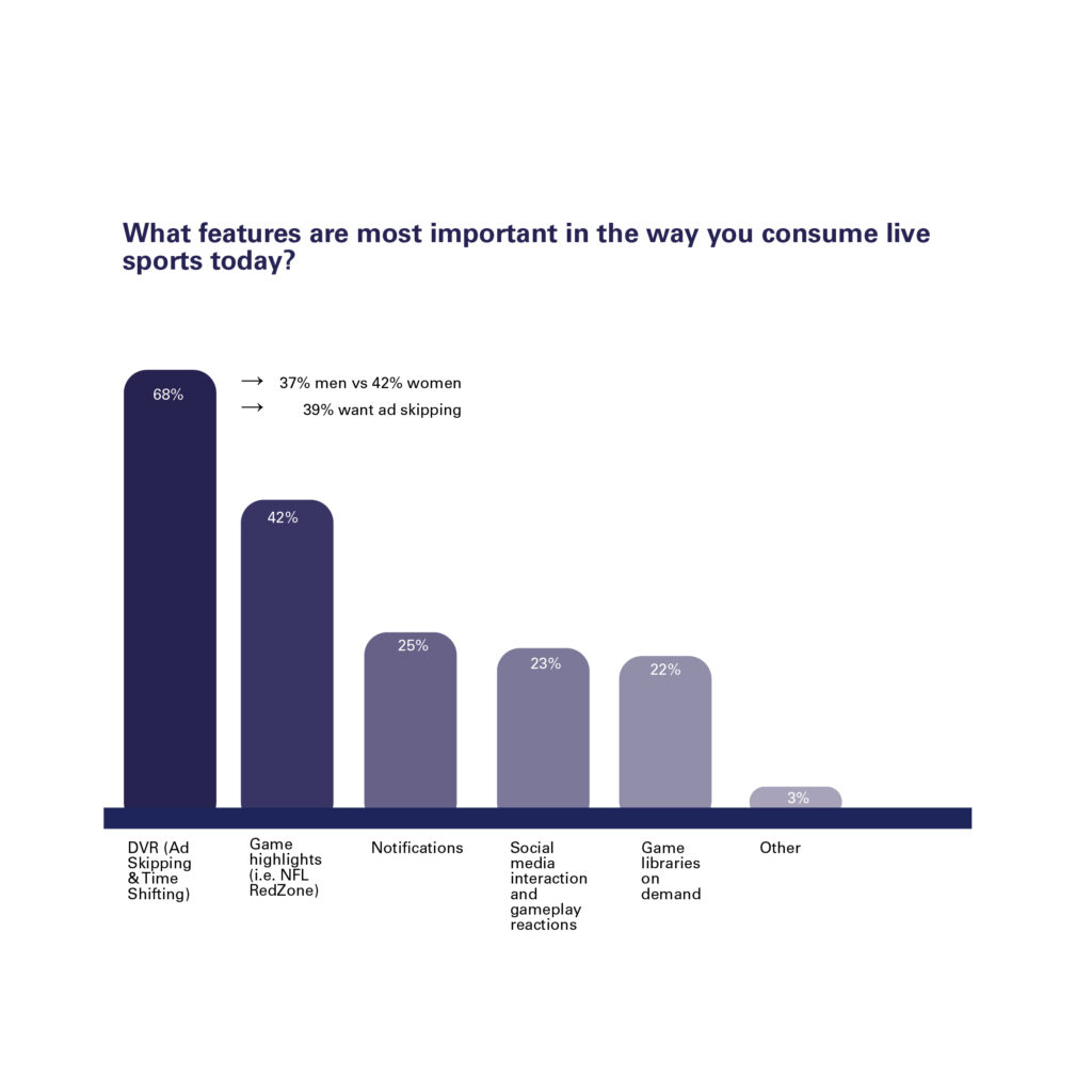 Approximately one in three are looking for more control over the live experience, wanting access to replay controls like slow motion (35 per cent), the ability to switch between camera angles (30 per cent), time-shifting (30 per cent) and the ability to skip ads (30 per cent).