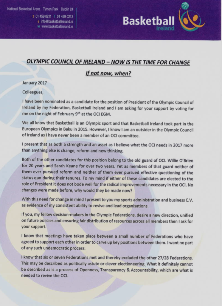 Presidential candidate Bernard O’Byrne was asking tough but pertinent questions of the incumbent council from when the news broke of Pat Hickey’s arrest. He followed through by putting his hand up to stand for President and now faces Willie O’Brien from Archery who has been acting President since August and Sarah Keane who headed up the Crisis Sub-Committee that was flagged as being from a reforming side of what remained of the current Committee.