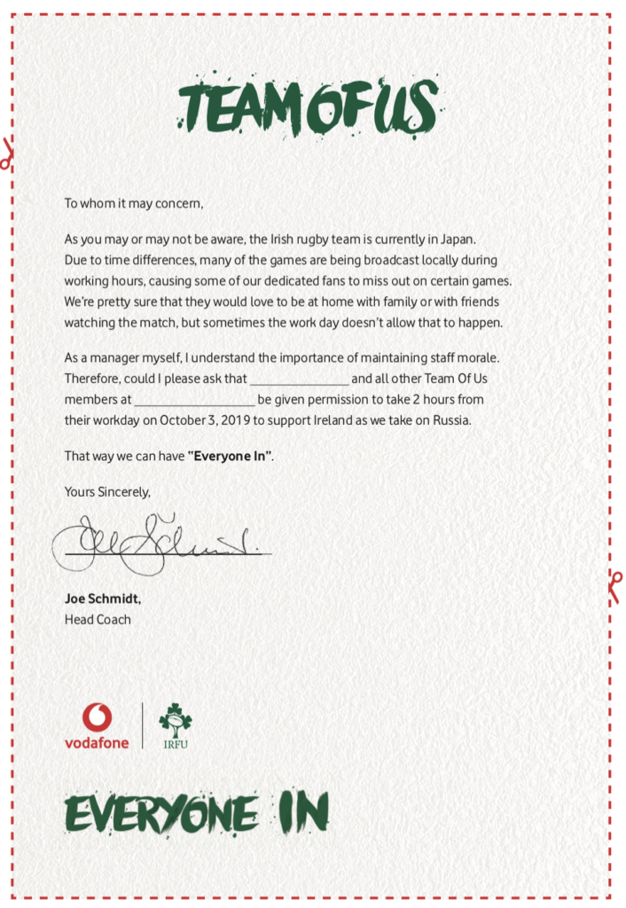 To help get bosses across the company to give their team time off to watch the game, Ireland Head Coach, Joe Schmidt has written a permission slip requesting each and every company across Ireland to get behind the team.