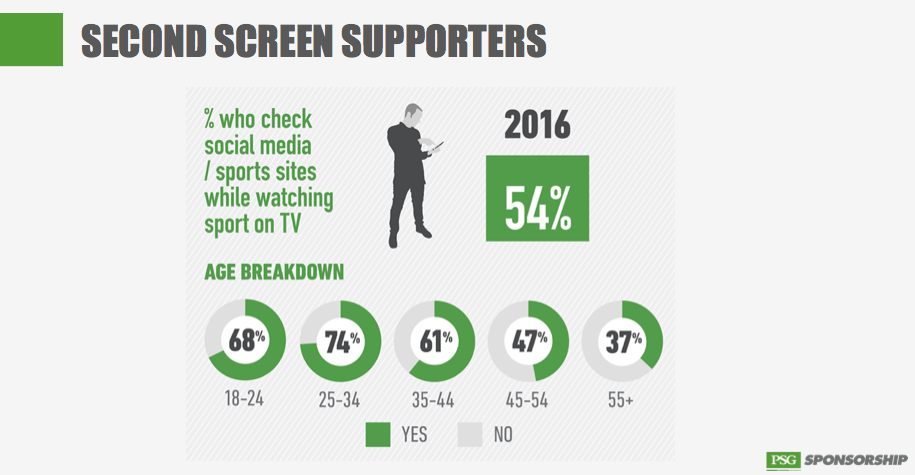 Analysis of ‘second screening or checking online sites and social media while watching sport revealed that this was as high as 74% among perhaps the key target for advertisers of the 25-34 year old millennials.
