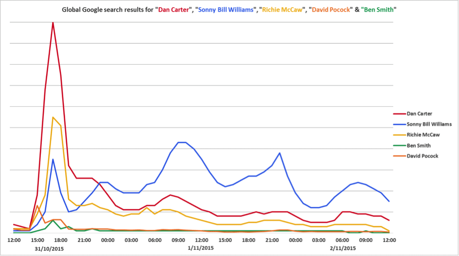 Unsurprisingly, New Zealand’s star men Dan Carter, Sonny Bill Williams and Richie McCaw were the most searched players after the RWC 2015 final. Search traffic for “Sonny Bill Williams” has maintained high levels of traffic for the days following the final. This is likely to be in reaction to the global media coverage of Williams giving away his winner’s medal to schoolboy Charlie Lines at Twickenham.