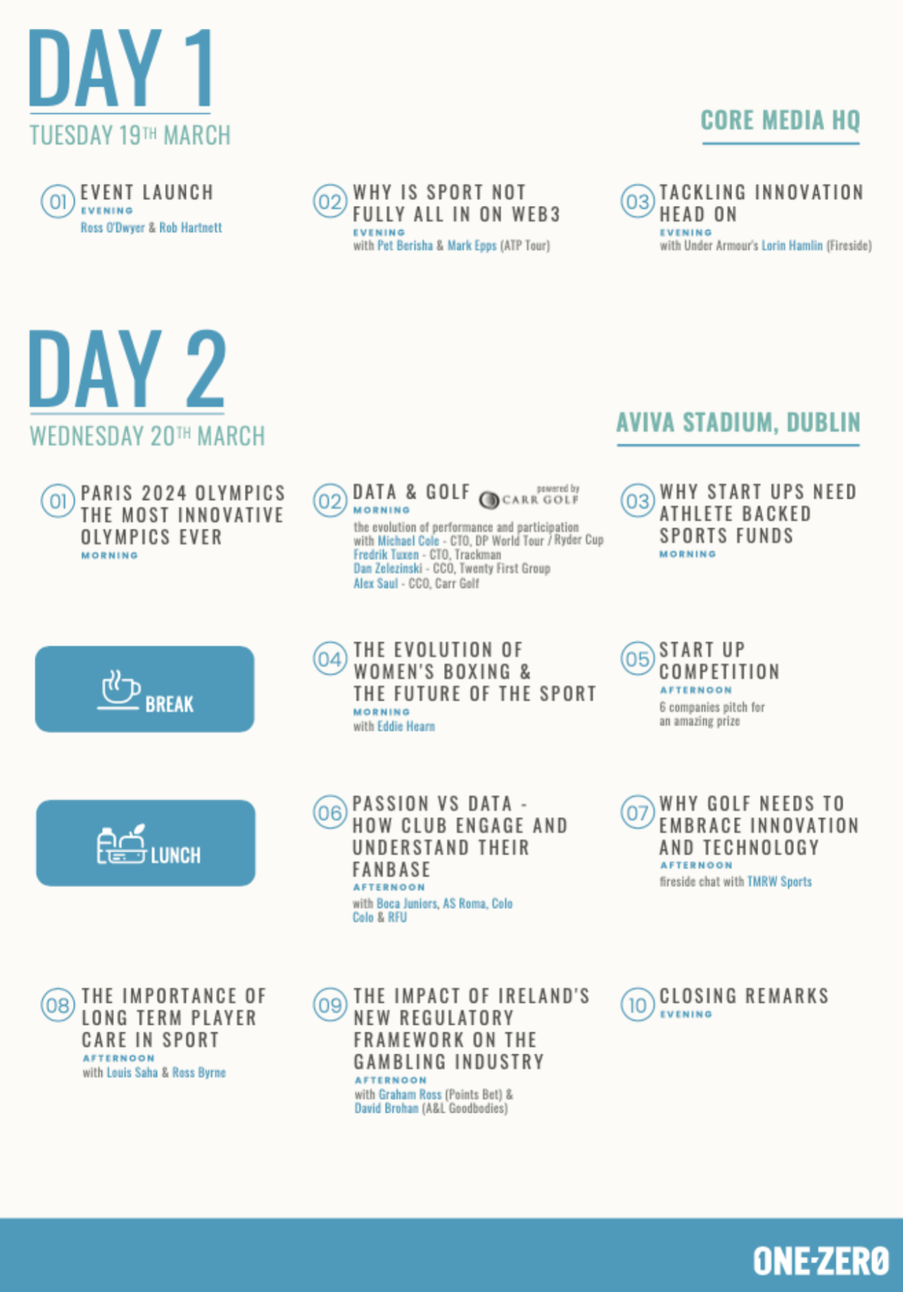 Taking place in the Aviva Stadium on the 19th-20th of March, One-Zero is set to welcome over 500 attendees from 100 different companies to discuss all things sports, innovation, and business.
