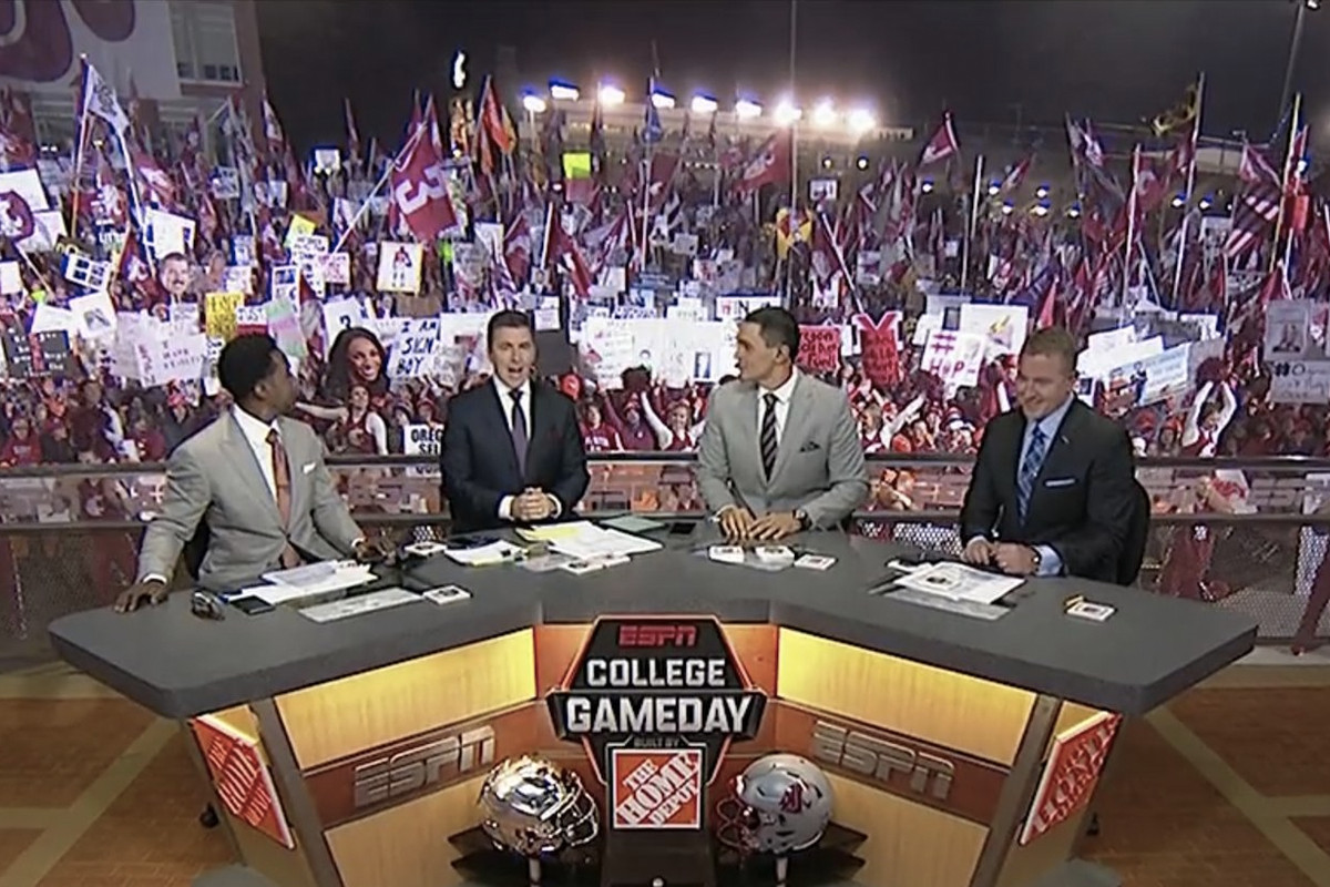 The show is noted for the colour and flavour of the outfits worn and banners flown by fans in the background as the presenters roll through what lies ahead for the day of sport that effectively stops a big part of America in its tracks.