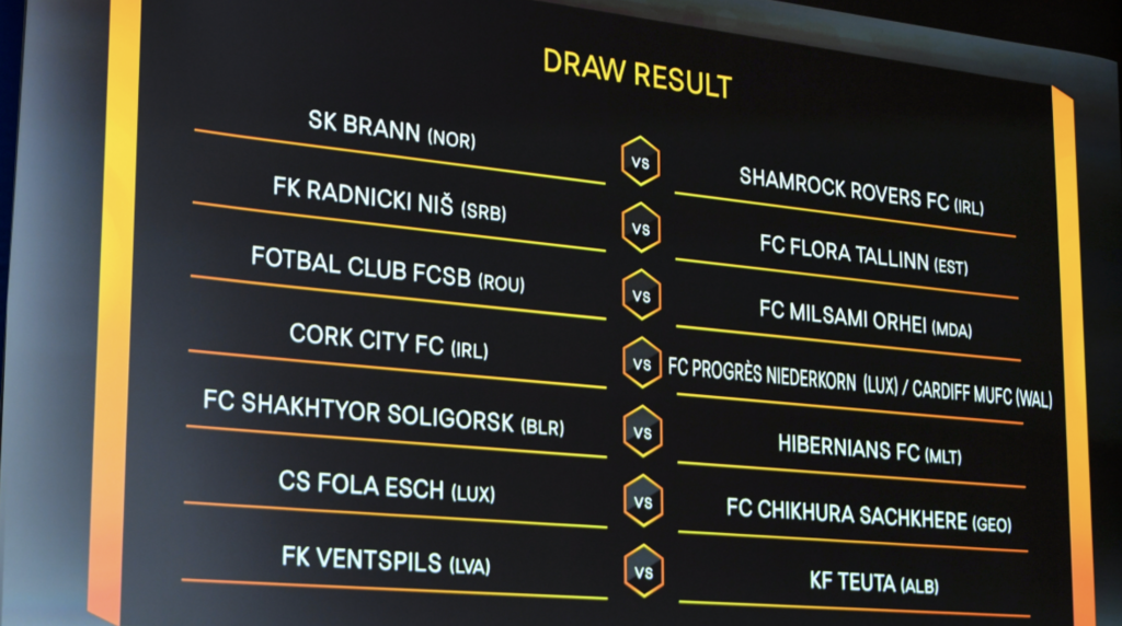 There are three Irish teams hoping to progress. Shamrock Rovers face SK Braan of Norway. Cork City will take on the winners of Progres Niederkorn and Welsh University side Cardiff Metropolitan while St Patricks Athletic will take on Sweden’s Norrkoping.